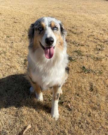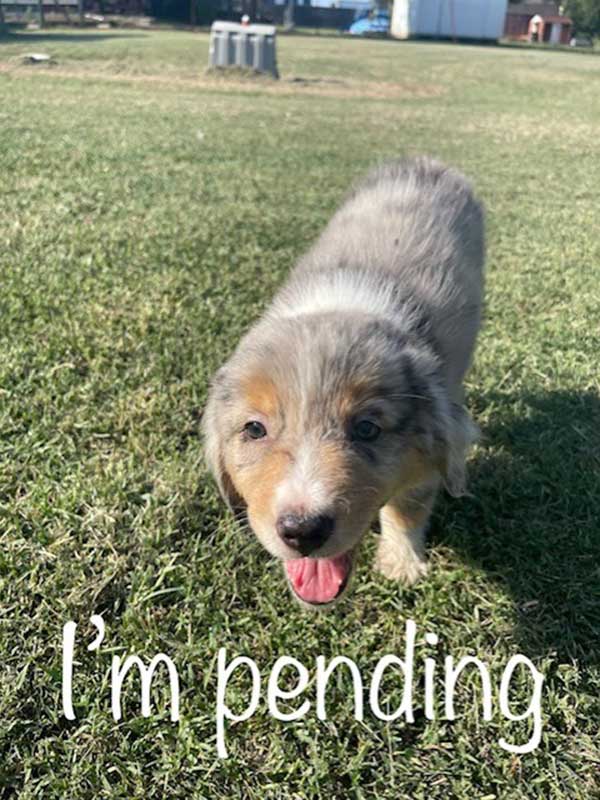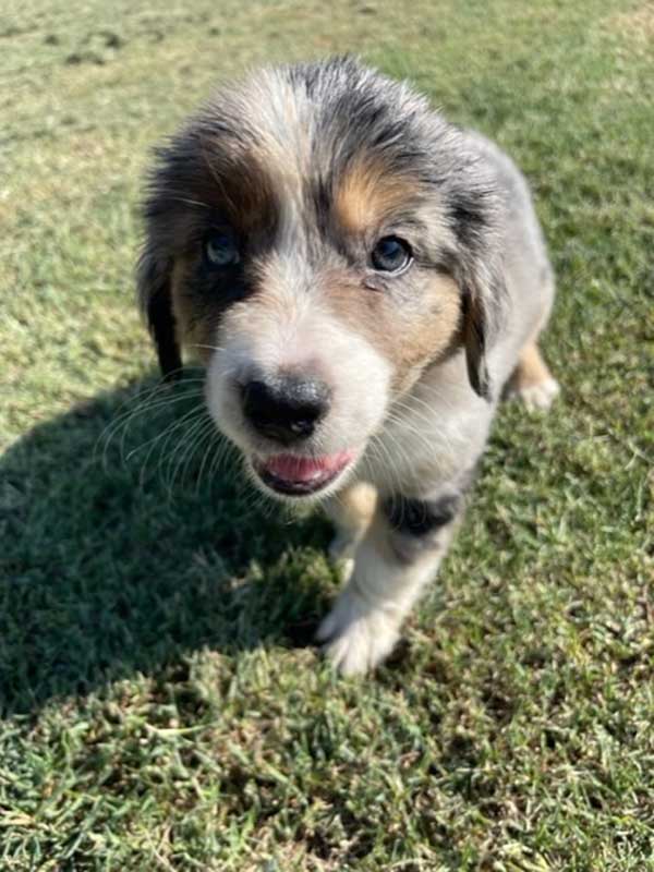 This one does not have a nickname yet. A male, Blue Merle Australian Shephard with blue eyes. Has a spunky personality.