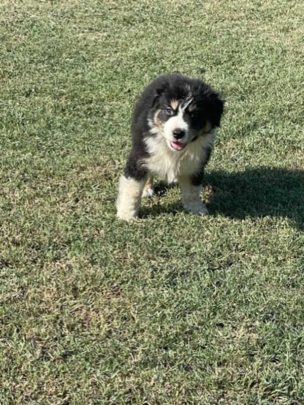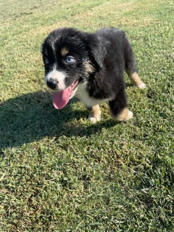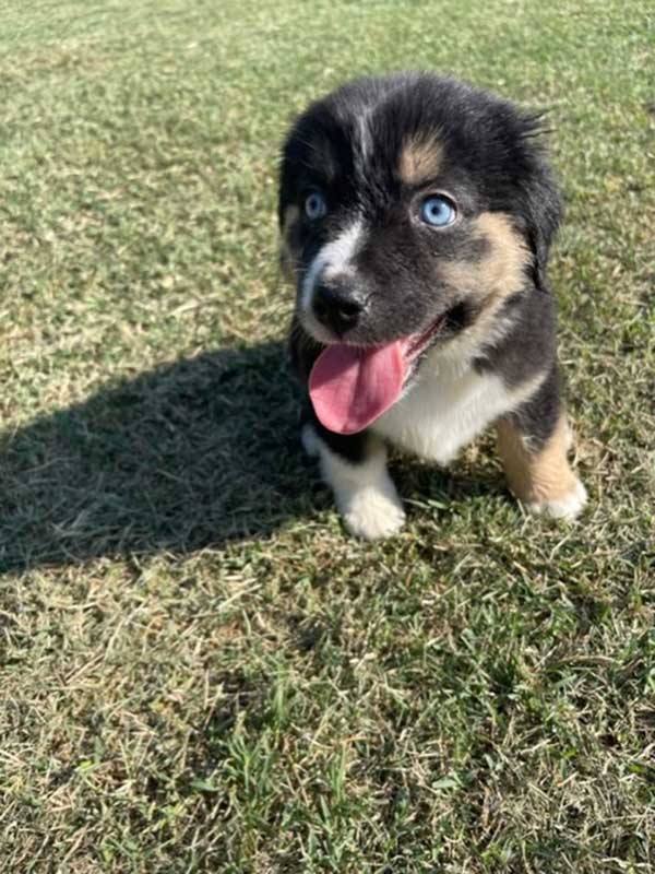 No nickname yet. A male, tricolor Australian Shephard with blue eyes. He’s a bit spunk, can be sweet at times.