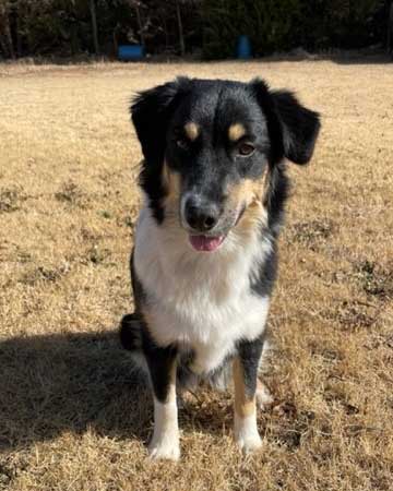 No nickname yet. A male, tricolor Australian Shephard with blue eyes. He has white fur on the right side of his nose and brown on the left side. This is spunky and loves to play.